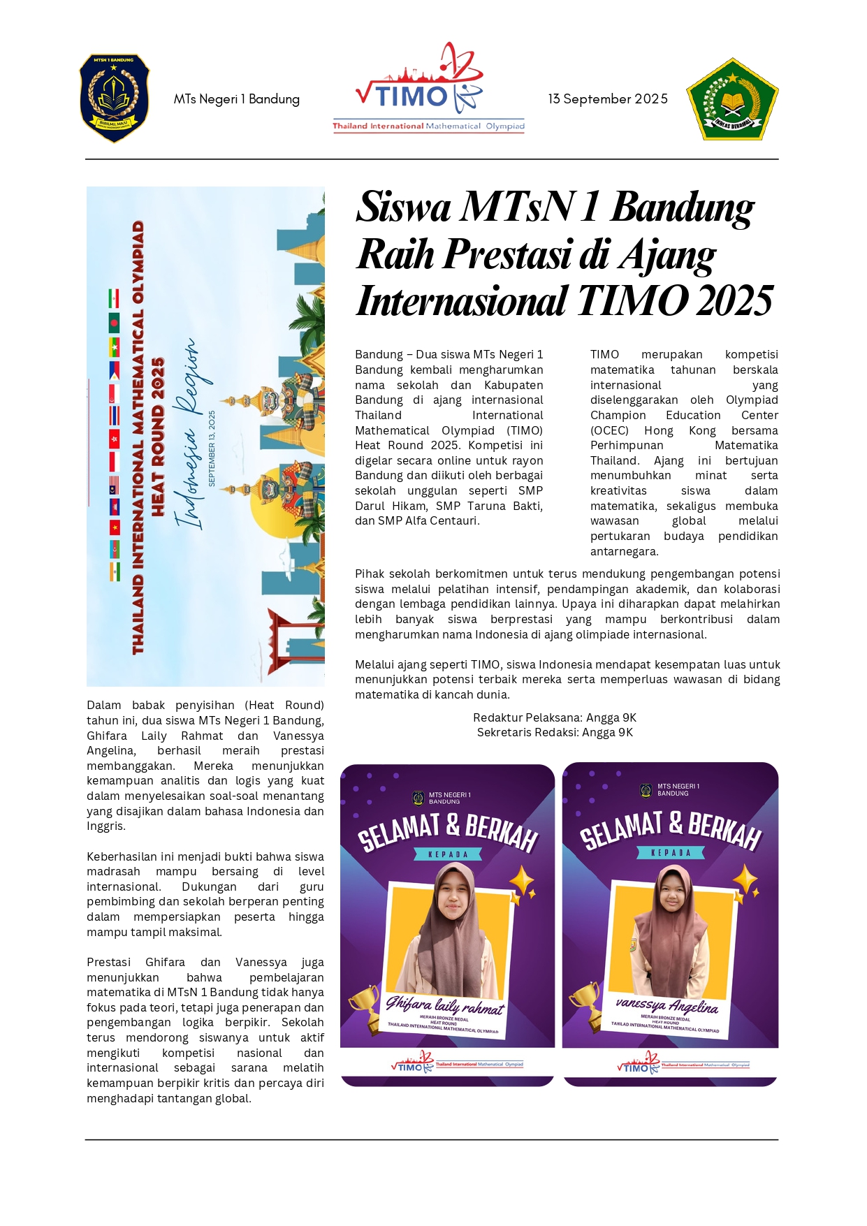 Siswa MTsN 1 Bandung Raih Prestasi di Ajang Internasional TIMO 2025