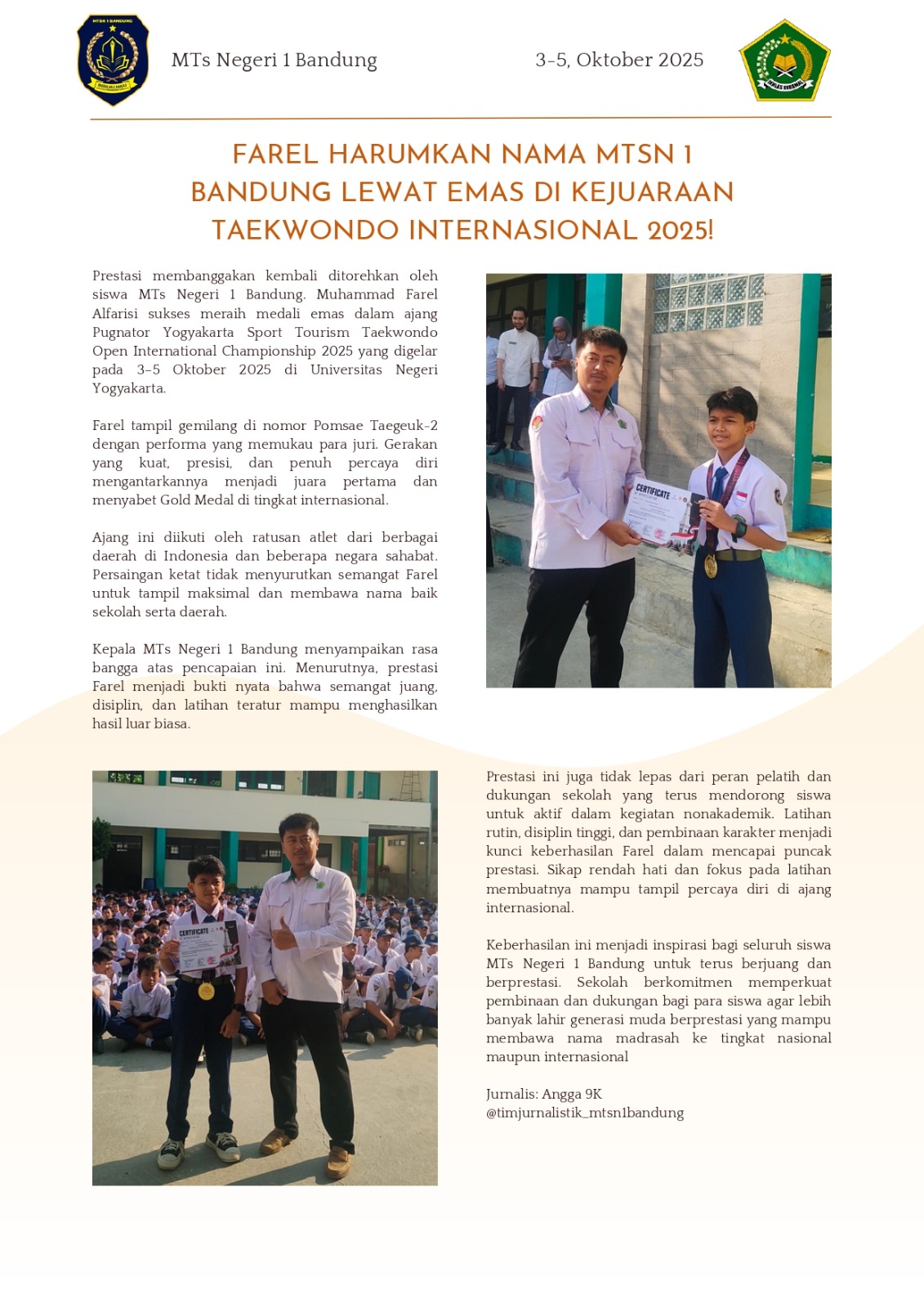FAREL HARUMKAN NAMA MTSN 1 BANDUNG LEWAT EMAS DI KEJUARAAN TAEKWONDO INTERNASIONAL 2025