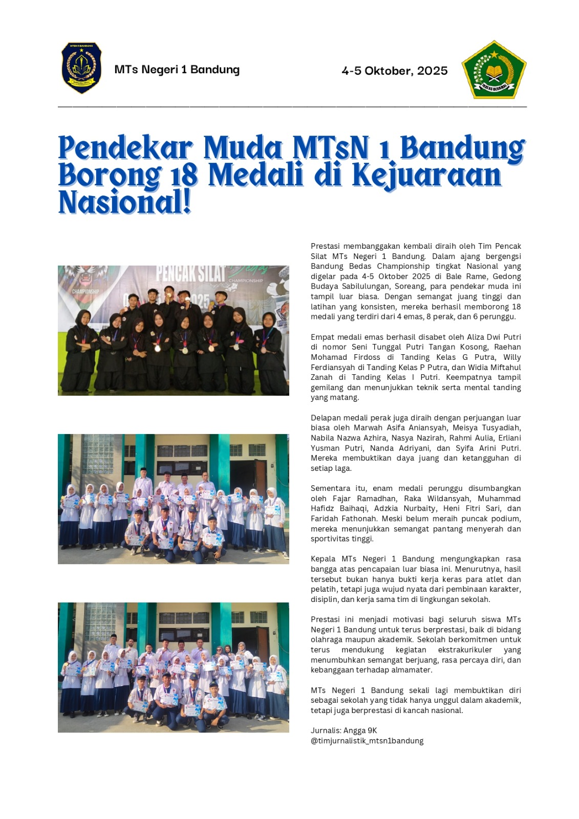 Pendekar Muda MTSN 1 Bandung Borong 18 Medali Di Kejuaraan Nasional